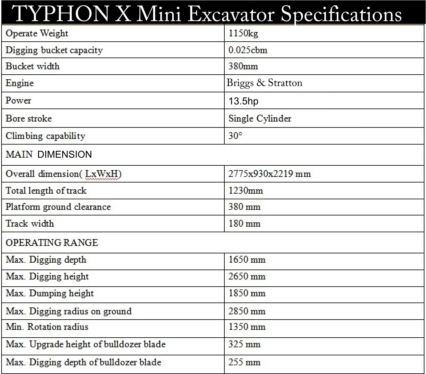 Introducing the TYPHON TERROR X Mini Excavator—a remarkable 1.15-ton gas-powered marvel meticulously engineered for small-scale projects. Designed to excel in gardens, farms, parks, and roads, this compact powerhouse combines a sleek design with a reliable, environmentally friendly engine, making it ideal for a multitude of tasks, including digging, drilling, and bull-dozing.